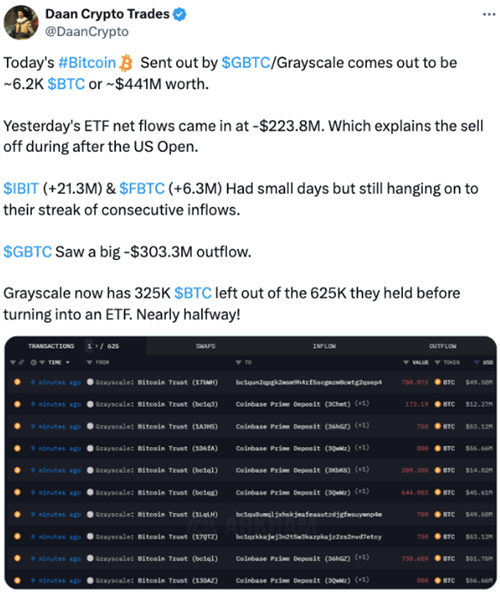 知名交易员Daan Crypto Trades在X上分享了加密情报公司Arkham的数据,数据显示资金流出约6200 BTC(4.34亿美元),这是几周来以美元计算的**流出量。