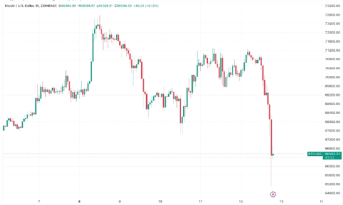 当天,纽约交易时间结束后的短短60分钟内,比特币价格从68341美元急剧下滑至65110美元,跌幅显著。与此同时,市值排名第二的以太坊也未能幸免,从开盘价3,553美元下跌8%,跌至3,226美元。