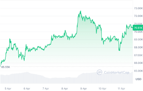与此同时,根据CoinMarketCap的数据,比特币的价格在过去24小时内上涨了2.08%,从70,215美元涨至当前的70,474美元。在公布美国3月份消费者价格指数(CPI)后,该指数一度触及67,482美元的阶段性低点。CPI同比增长3.5%,高于市场预期,这进一步引发了人们对于美联储可能会推迟降息的担忧。