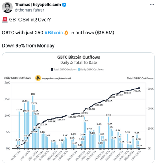 在这一背景下,一些加密货币评论员希望GBTC的流出放缓能成为一个趋势。自1月份GBTC转换为现货比特币ETF以来,其流出额已经达到了160亿美元。专注于加密货币的评论门户网站Apollo的**执行官Thomas Fahrer在4月11日的帖子中向他的41,500名关注者提问:“GBTC卖完了吗?”他指出,4月10日的流出量大约相当于250个比特币,相较于本周初的流出量减少了近95%。