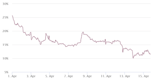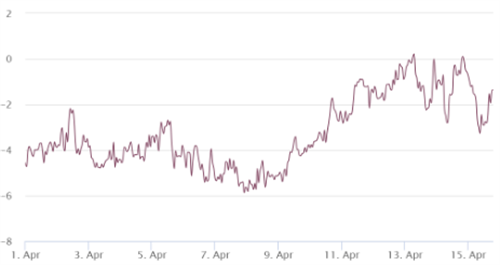 在过去两周里,BTC期权的25%德尔塔偏度保持在一个中性的区间内,这表明看涨和看跌策略的需求保持平衡。另一个重要的事实是,在4月13日比特币测试61500美元支撑位时,并没有出现恐慌的迹象。综上所述,市场数据并未显示出投资者存在**重大的担忧或乐观情绪有所下降。