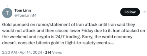 分析师汤姆林恩认为,最近的价格波动表明,投资者并未将比特币视为安全的避风港,而黄金在4月12日军事冲突的消息传出后却升值了。然而,这一分析可能忽略了黄金市场在周末不运作的事实,以及过度杠杆化等其他因素可能影响比特币表现的情况。
