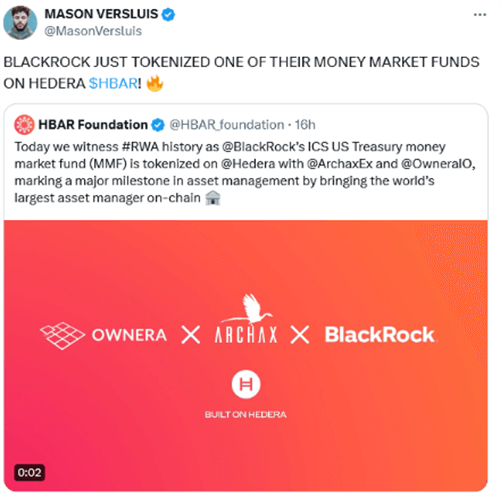事件起源于4月23日,与Hedera社区紧密合作的HBAR Foundation X发布的一篇帖子。该帖子宣布,区块链交易和基础设施公司Archax和Ownera已在Hedera网络上对贝莱德的ICS美国财政部基金进行了**化。此外,随帖子发布的一段视频似乎暗示Ownera、Archax和贝莱德在此项目中进行了合作,HBAR甚至声称这一举措“将世界上**的资产管理公司引入链上”。