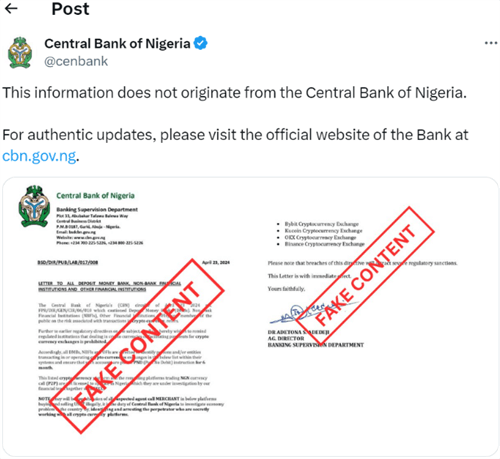 CBN通过官方渠道迅速对这些报道进行了反驳。尽管**财经曾一度发布官方帖子进行否认,但随后又删除了该内容。几个小时后,CBN再次发布声明,坚决否认了这些指控,并向公众保证,其官方网站上从未发布过**关于冻结与加密货币交易相关银行账户的正式命令。该行强调,公众应仅依赖其官方渠道以获取“真实信息”。