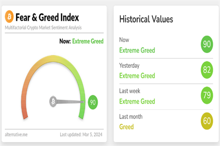 与此同时,比特币在密码恐惧与贪婪指数上的得分也飙升至90分,为自2021年2月以来的**水平。这表明市场情绪极度贪婪,但也可能预示着市场即将进行调整。
