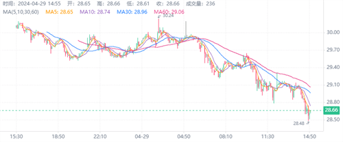 24小时的**价格为:$30.1716,24小时**价格为:$28.4190,24小时**成交量:226.76万,24小时成交额:$6442.71万,量比:0.94。