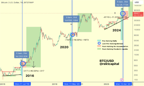 Rekt Capital在3月17日的帖子中指出,比特币在过去两次减半前的14至28天内都经历了价格下跌。2016年减半期间,比特币价格下跌了40%,而2020年则下跌了20%。他预测,类似的回调可能在未来几天内发生。