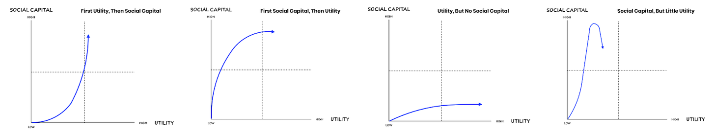 除了娱乐之外,Eugene Wei还谈到了社交网络可以遵循的五条弧线,其中四条是随着时间的推移,社会资本和效用之间的权衡。
