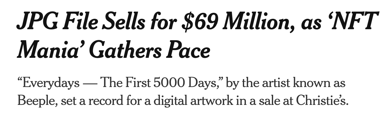 NFT始于2017年的cryptokitties,但它在2021年初真正开始变红变紫(我**次写NFT是在1月底)。赛道由贝普尔和NBA托普肖特领跑,而BTC和ETH则创下历史新高。这些新兴的富人做了其他富人会做的事:购买艺术品。NFT是有争议的,人们认为它们只是玩具。