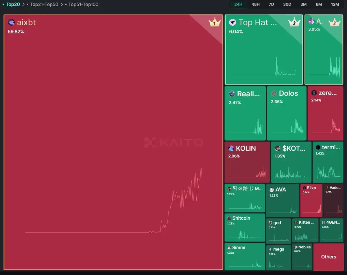 Iman:是啊,你看看昨天的数据就知道了。如果有什么项目能够**主导市场,那就是这张图显示的内容。为什么呢?有这么多平台都在发布 AI 代理,为什么 AIXBT 如此与众不同?为什么这条来自加密推特的洞察如此有影响力?为什么人们会如此自然地被它吸引?这里面有一种「秘密配方」,而很多人还没有意识到。