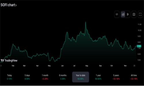 SoFi 股票在 2023 年出现了一些波动,年初价格仅为 4.50 美元,但在 7 月份飙升至 11.45 美元。此后,SoFi 股价逐渐下跌,11 月中旬跌破 7 美元。