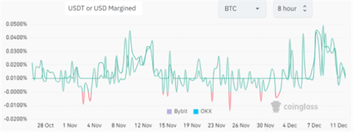 正供资率表明长期头寸对杠杆的需求增加。请注意,数据显示12月间略有增加。12月8日10-0.045%,相当于每周0.9%,这对大多数交易员来说既不重要也不给他们带来负担。