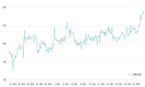 自12月1日以来,BTC期货溢价一直保持在10%的中性至看涨阈值之上,这表明对杠杆多头头寸(买入)的需求略有过高。这些数据显示,尽管最近在44,000美元处遭到拒绝,交易员们的立场没有改变,而12月21日的**修正也不例外。