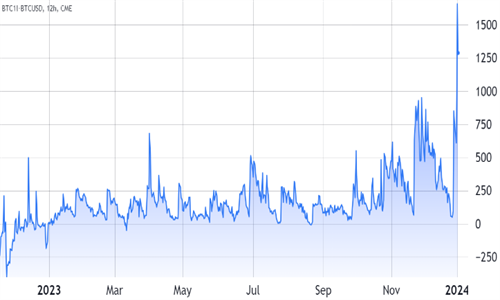 在健康的市场中,月度期货合约的交易通常会有5%至10%的基差率,以适应更长的结算时间。这种情况被称为“contango”,并不局限于加密货币衍生品。值得注意的是,在2023年1月至2023年11月期间,芝加哥商品交易所的比特币期货相对于BTC现货市场的溢价非常低,盘中高点很少超过350美元,相当于年化14%。