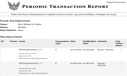 在2024年,佐治亚州众议员迈克·科林斯(Mike Collins)向美国众议院提交的披露文件显示,他购买了价值高达6.5万美元的以太币(Ether,ETH)。具体来说,他于1月3日购买了价值**达1.5万美元的以太币,1月8日再次购买了价值**达5万美元的以太币。据类似文件记录,这位美国议员自2023年以来一直在交易以太币,总购买量高达11万美元。