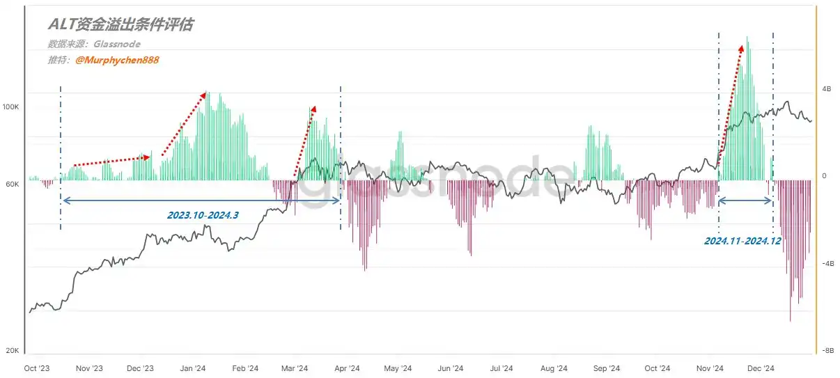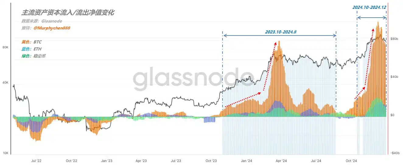从数据上看,在 2023.10-2024.8 和 2024.10-2024.12 这两段时间内三大主流资产同时出现资本净流入,且在 2024.3 月和 12 月达到**。这也是本轮周期内到目前为止市场情绪最 Fomo 的时间点。