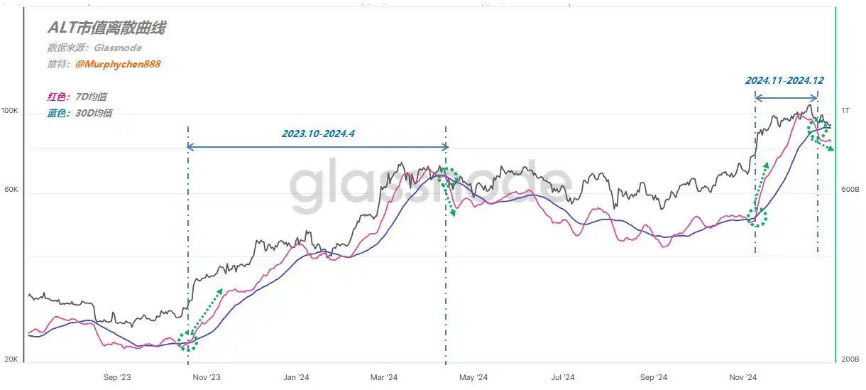 图 3 中红色为 7D 均值,蓝色为 30D 均值;从数据上看,在 2023.10-2024.4 和 2024.11-2024.12 这两段时间红线上穿蓝线,意味着币圈的流动性开始像山寨币倾斜,山寨币市值正在转向动量正增长阶段。