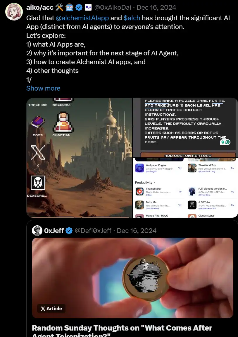·Agentic L1s:像 virtuals io 和 ai16zdao 这样的平台正在提升标准,确保它们的生态系统注重质量。Virtuals 依旧是代理的** L1,很快,ai16zdao 的启动平台也将加入竞争。单纯依靠个性的代理正在消失,取而代之的是既有用又引人入胜的代理。