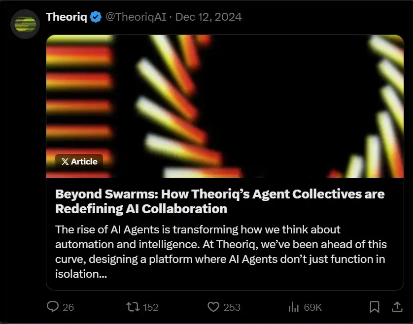 ·Coordination Layers:这些层,如 TheoriqAI,将协调一群代理,结合它们的优势,为用户提供无缝且强大的结果。试想一下,将 aixbt、gekko 和 CPA 等代理整合在一起,提供 alpha 来源、执行交易和处理税务——所有这一切都在一个连贯的工作流中完成。Theoriq 的基于任务的发现框架是解锁集体智能的一步。