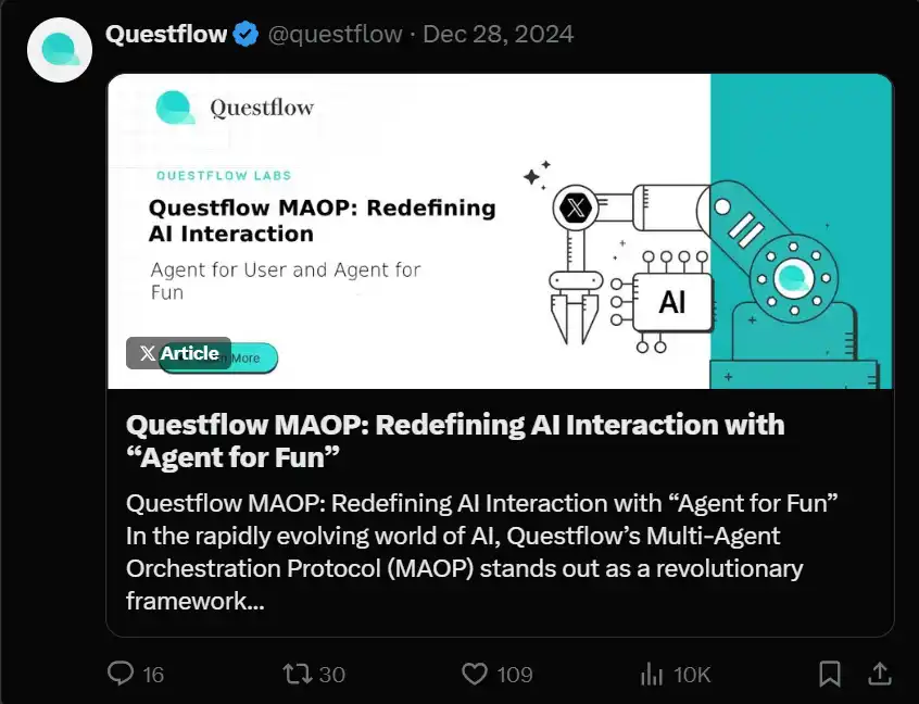 ·questflow:一个多代理协调协议(MAOP),用于实现提升生产力的应用场景。Questflow 与 Virtuals 的集成创建了 Santa 代理,能够将空投游戏化并管理激励机制。