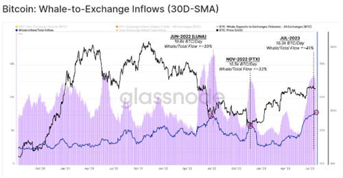 近期,鲸鱼交易活动有所增加,7 月份一度占总流入量的 41%。
