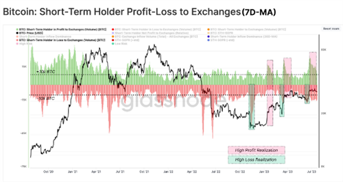 Glassnode 继续说道:“如果我们观察流入交易所的短期持有者数量所实现的损益程度,就会发现这些新投资者显然正在根据当地市场状况进行交易。”
