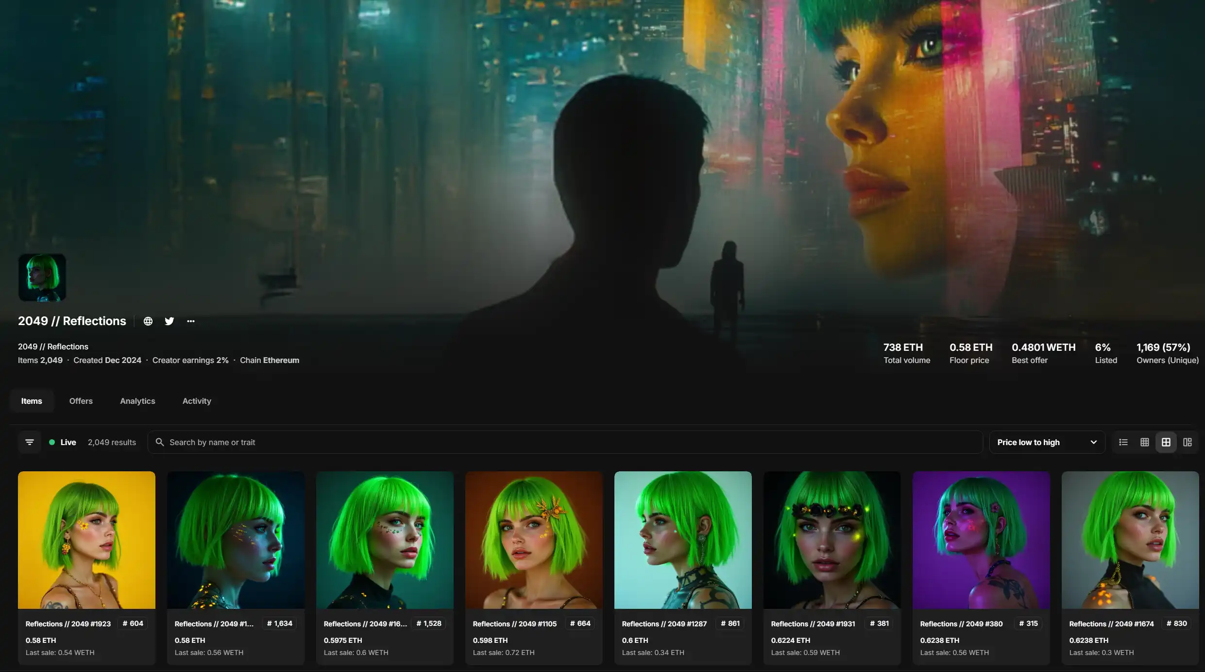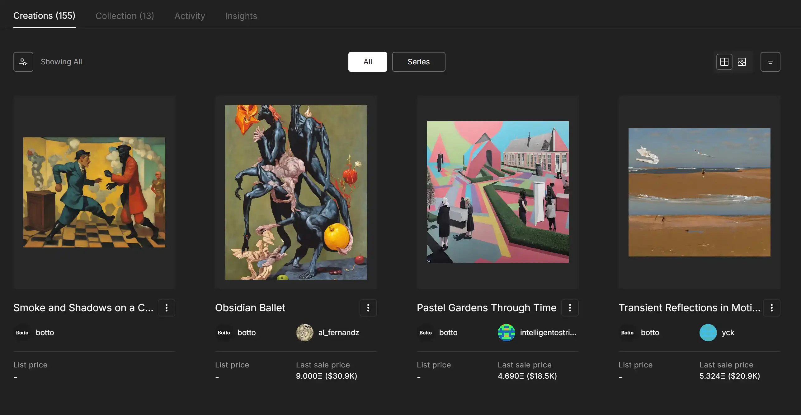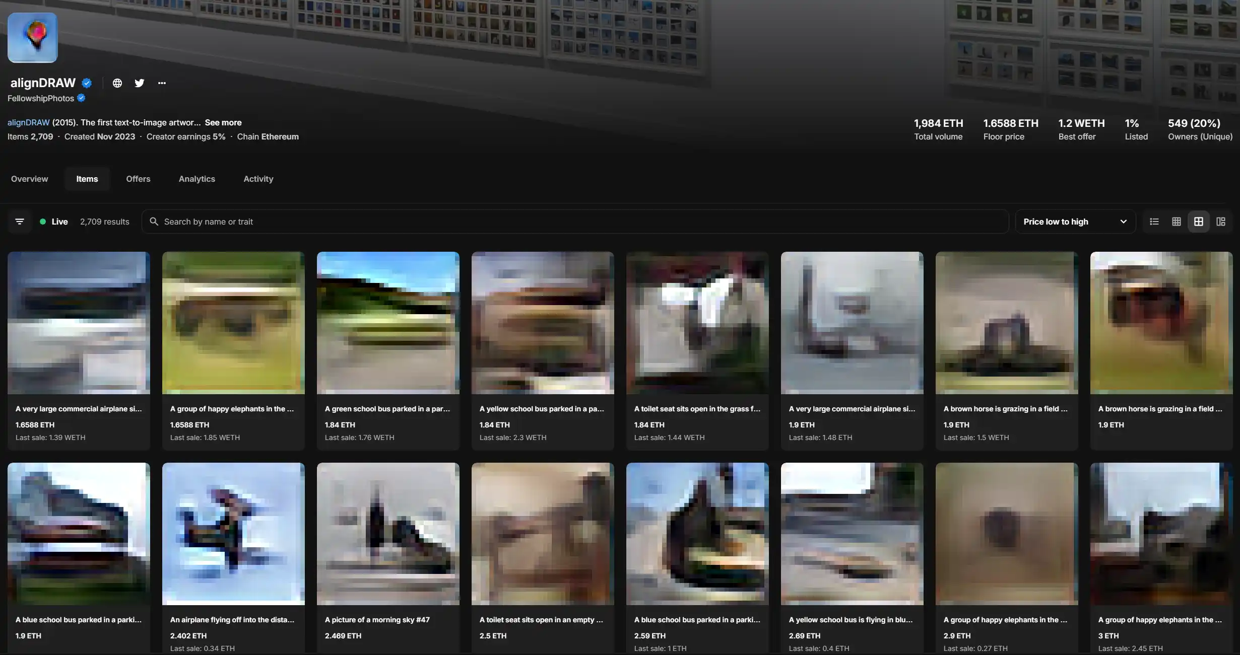 这是一个纯艺术项目,主打的就是一个 AI 发展历史叙事。2024 年,该系列曾达到历史**价接近 3 ETH,最开始的铸造价格则是 0.1 ETH。目前,该系列地板价约为 1.66 ETH。