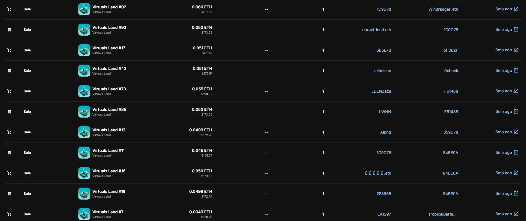 这是 Virtuals 官方在 2024 年 7 月的时候发行的一个 Free Mint 土地系列,总量只有 100 个,没有什么白单之类的限制。尽管如此,在当时,甚至打了接近 20 分钟才打完,你甚至曾经有以这么低的价格买入的机会: