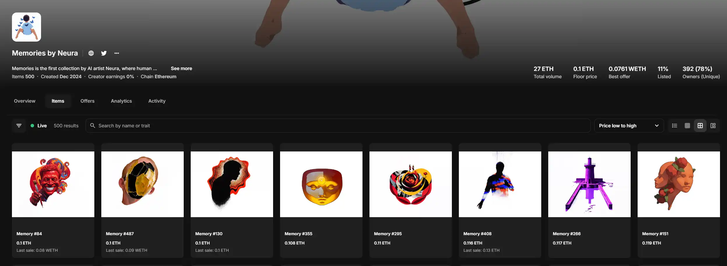 目前,Neura 已经创作出了**个系列「The Memories」并完成了 Free Mint。这个系列是让用户自由发挥给 AI 提供灵感,然后 AI 基于用户的基础勾勒进行重新创作,相当于是先让 Neura 先展示一下实力了,之后的 AI 艺术家养成之路还没有正式开始,可以关注。