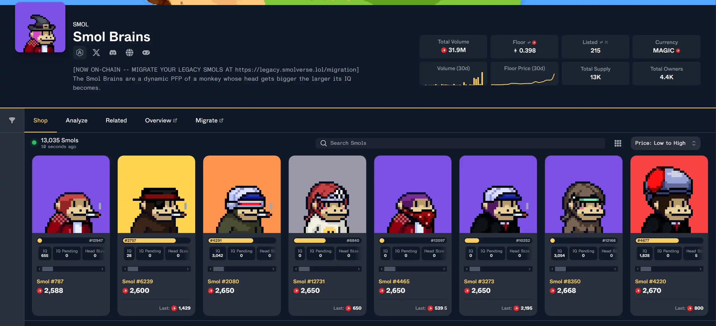 最近一周,Smol Brains 上涨了 4 倍,目前地板价接近 0.4 ETH。