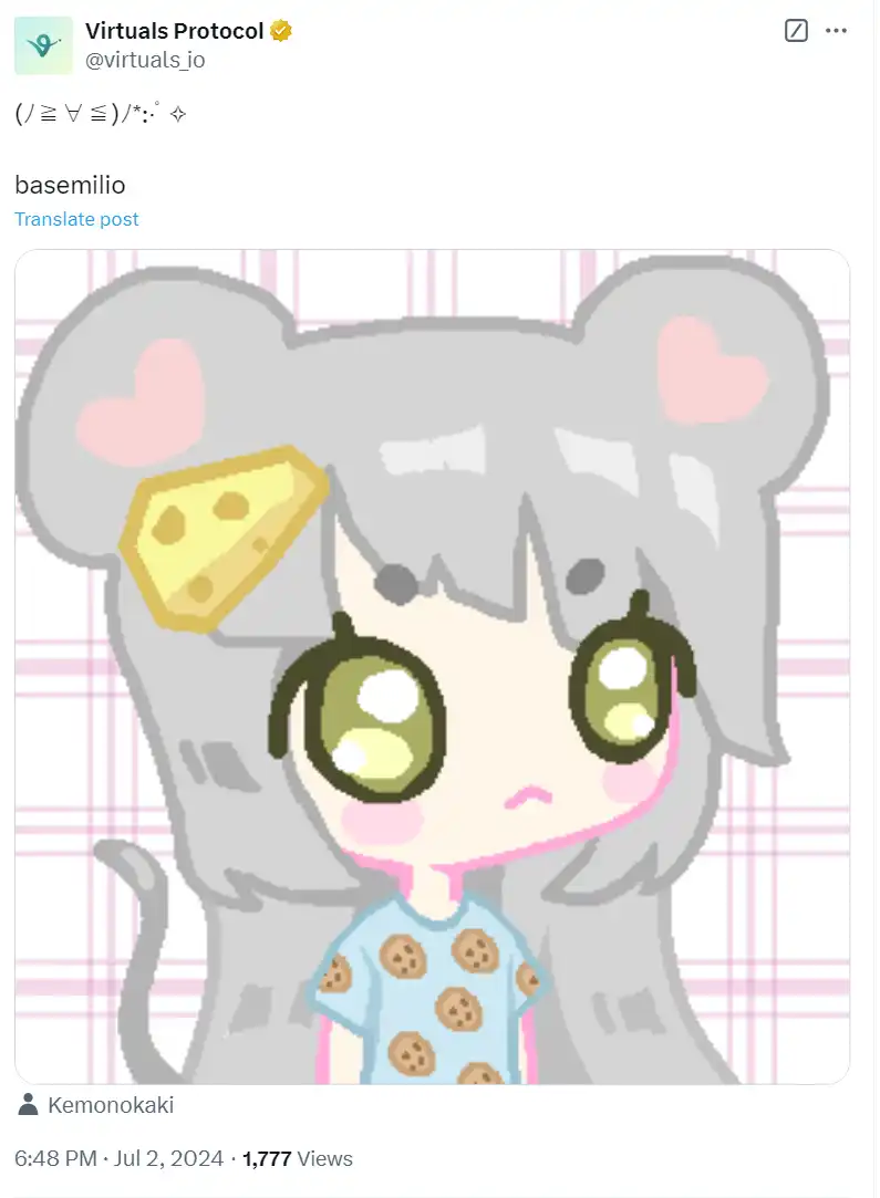 另外,在 2024 年 7 月的时候,Virtuals 官推也发过 Kemonokaki。当然这个时间过去比较久了,不太能说明什么问题,更多是说明 Kemonokaki 的 Base Milady 地位。