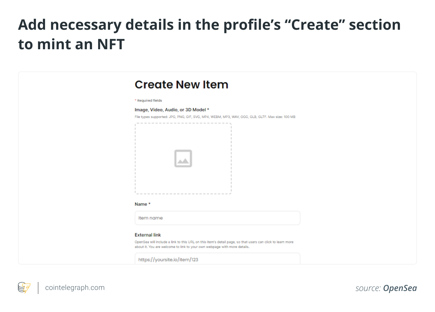 要铸造 NFT,首先在您的个人资料的“创建”部分创建一个列表。上传视觉效果和详细信息,自定义 OpenSea URL,并设置价格或拍卖参数。下一步是确认交易并铸造 NFT。