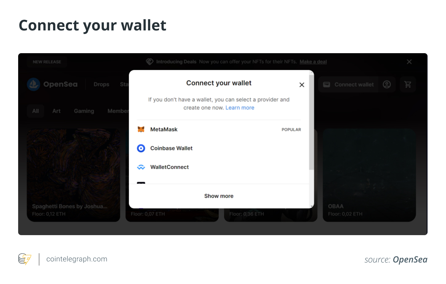 然后,用户需要通过“菜单”部分中的“连接钱包”选项卡登录,为其钱包充值并创建 OpenSea 帐户。以太坊是 OpenSea 上 NFT 交易的主要货币,但 Wrapped Ether (wETH) 在智能合约中使用,以实现更顺畅的集成。虽然 ETH 和 wETH 是**,但也接受超过 150 种其他**。