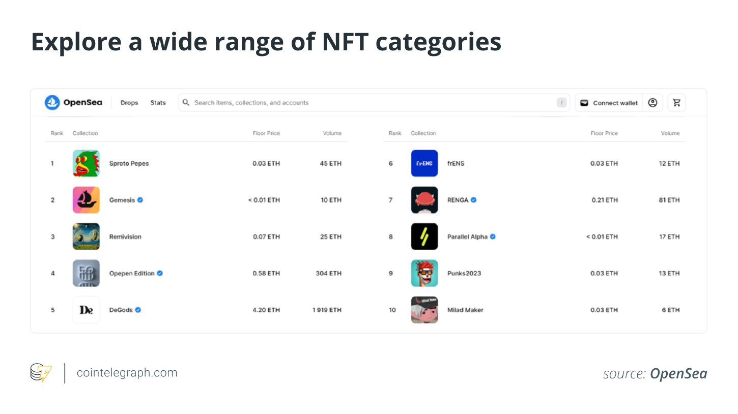 - 广泛的 NFT 类别:OpenSea 涵盖广泛的 NFT 类型,例如艺术、音乐、收藏品、虚拟土地、域名和实用 NFT,吸引了广泛的受众。