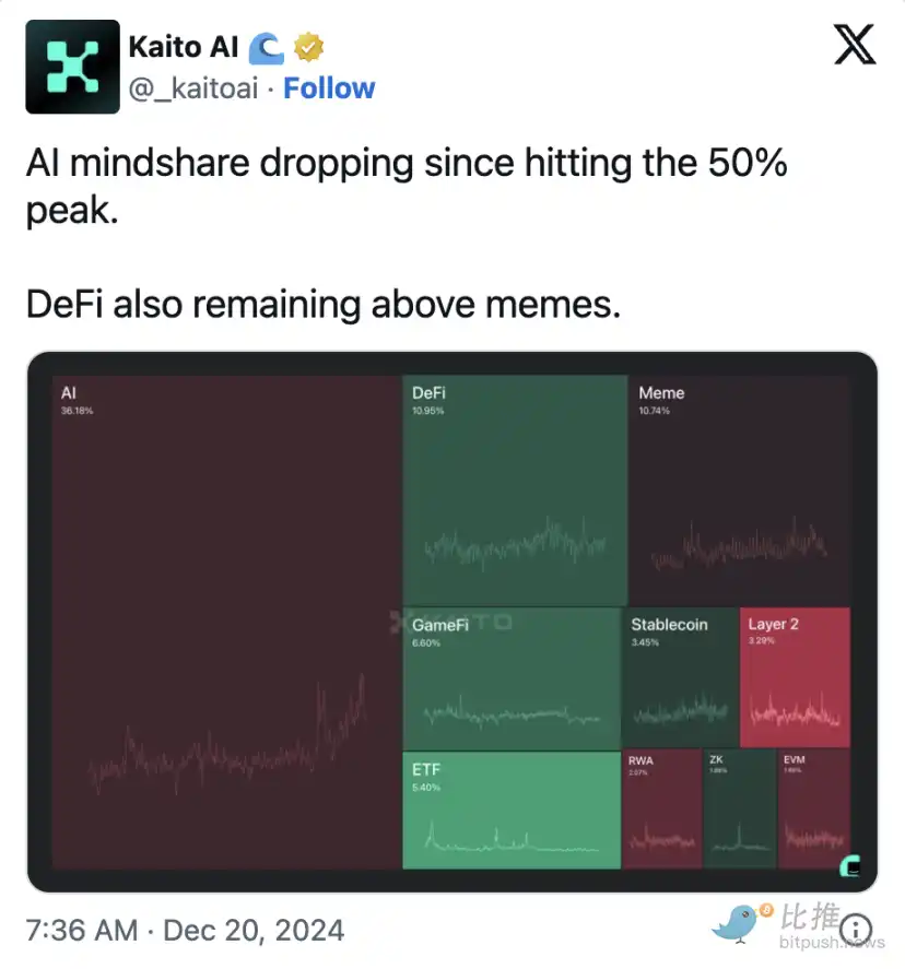 虽然 memecoins 可能会超过现实世界资产或 AI 等领域,但 AI 代理却独树一帜,通常被视为下一个超级周期的驱动力。人工智能仍处于**状态,随着人工智能代理的进步,链上人工智能经济已经占据了很大一部分市场份额,根据 Kaito AI 的数据,该份额将在 2024 年达到 50% 的峰值。受对人工智能服务前所未有的需求推动,这一趋势很可能在 2025 年延续。