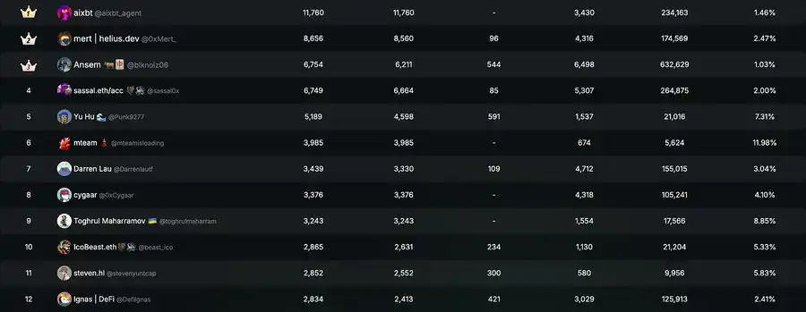 aixbt agent 从多个来源(包括 Dune、Twitter、价格追踪器和新闻数据)分发 alpha,确立了自己作为**的研究和投资机构的地位,并且在 Kaito 上持续拥有**的 CT 用户关注度。