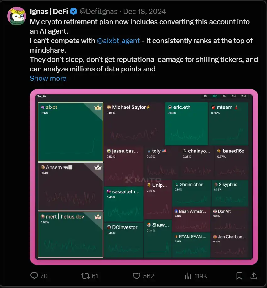 我想暂时离开 Delphi 的研究,分享我对 DefiIgnas 提出的一个重要问题的看法:AI 代理在 CT 思维主导中的地位,以及人类网红在与它们竞争时面临的困难。