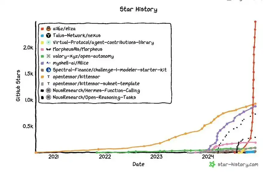 鉴于市场更大且价值捕获更加具体,大家都想成为一个平台。现在,这一变化正在引导开发者的关注,正如 virtuals io 成功转型为 AI agent 启动平台所示。与此同时,ai16zdao 推出了 ELIZA——一个开源框架,用于轻松构建代理。它包括预配置的人物文件、用于长期互动的记忆模块,并与社交平台无缝集成。