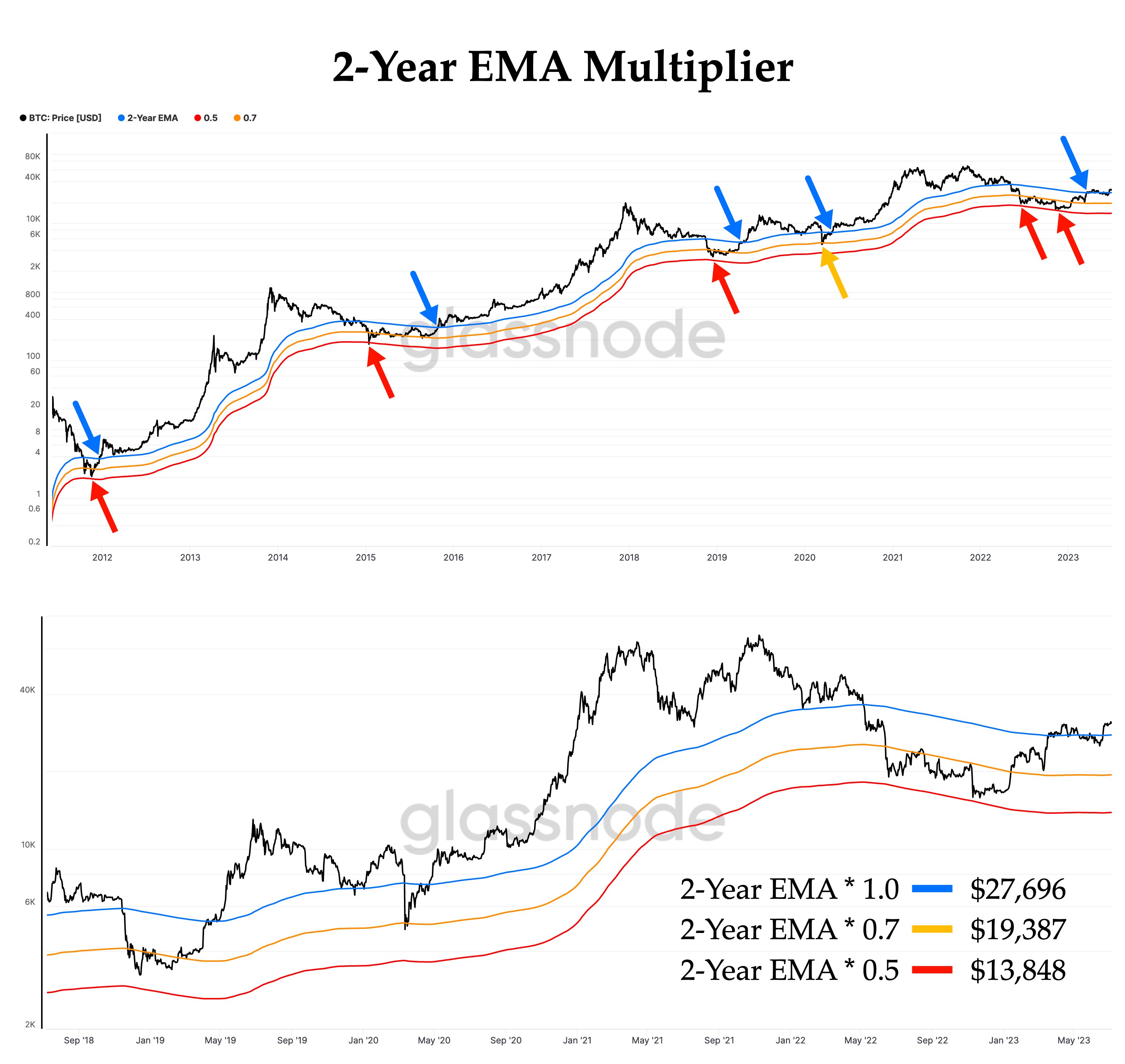 随附的图表显示了所谓的“2 年 EMA 乘数”,描绘了过去几年 BTC 围绕趋势线的价格行为。