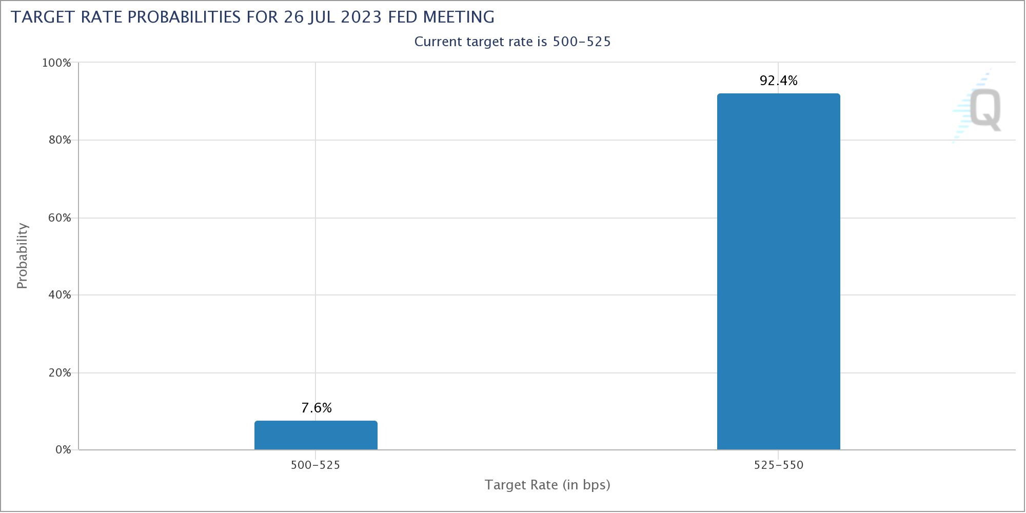 6月14日鲍威尔发表联邦公开市场委员会(FOMC)讲话后,市场似乎自信地相信美联储将再次开始加息。CME 的 FedWatch工具显示,市场相信 7 月 26 日的下一次 FOMC 会议将出现加息。截至 7 月 6 日,加息的可能性为 92.4%。