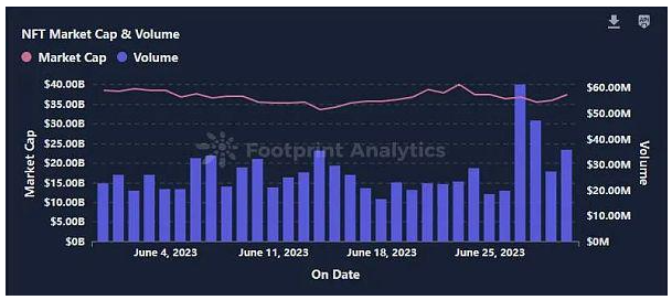 从交易量上来看,NFT 市场在 6 月份经历了一些波动。月初,交易量为 2,620 万,到 6 月 18 日下降至**点 1,659 万,月底交易量反弹至 3,586 万。6 月 27 日交易量达到 6,145万,这在很大程度上归因于 Azuki,单个系列交易量就达到了 2,000 万。