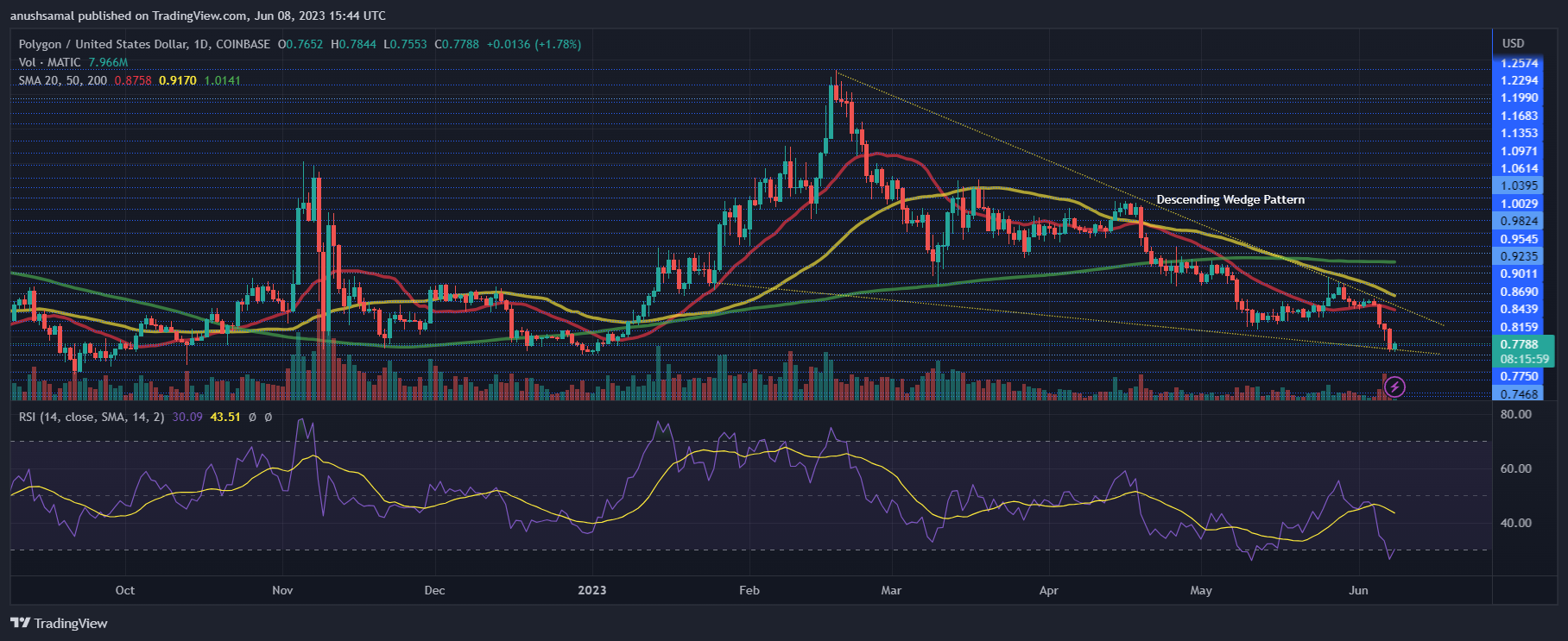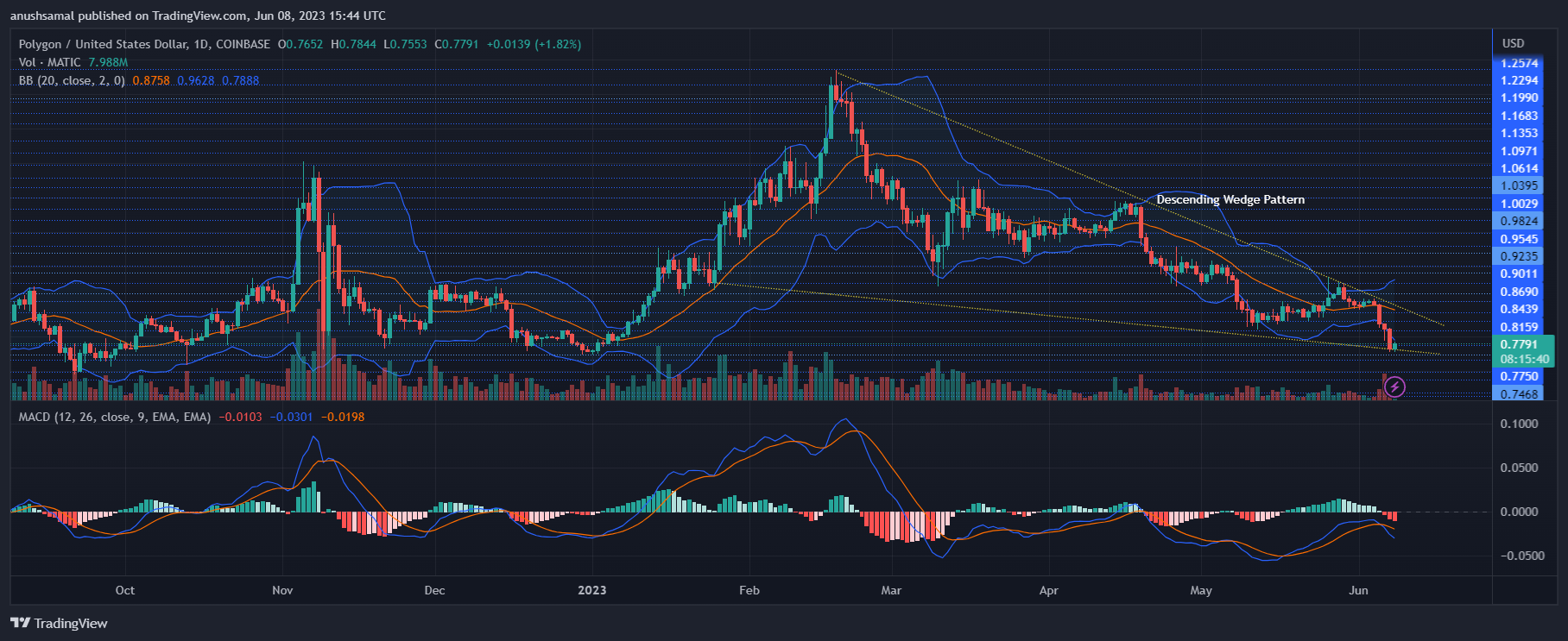 值得注意的是,**已经形成了一个下降的楔形图案,这通常与看涨的价格反转有关。如果出现上行突破,MATIC 可能反弹至 1.50 美元。