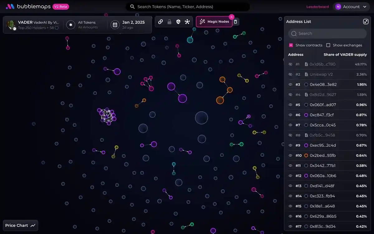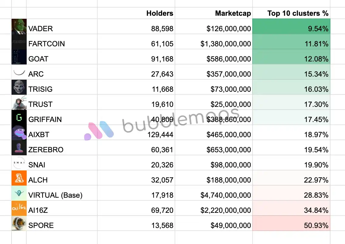 在这份名单中,$VADER 是前 10 个集群持有比例**的 Token,仅为 10%。