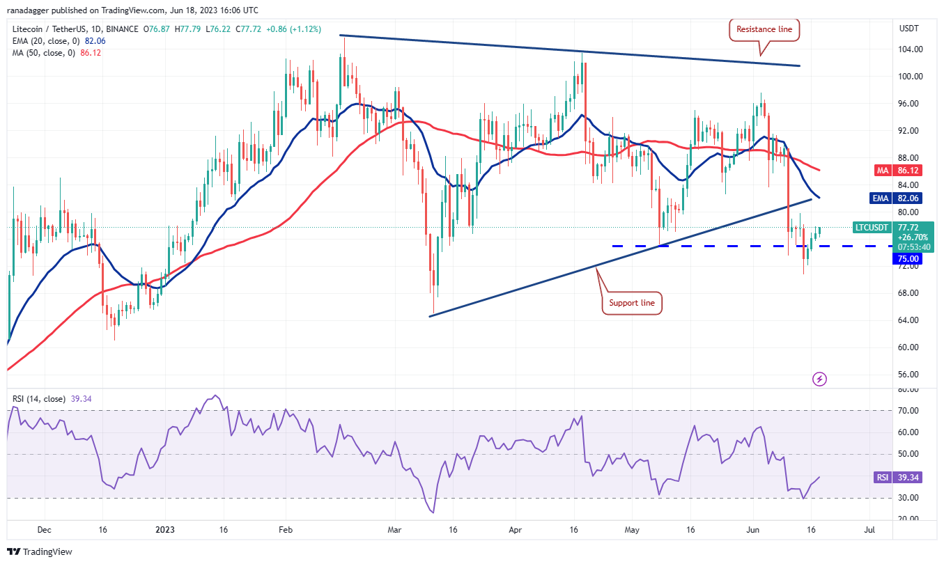 莱特币6 月 10 日跌破对称三角形形态,表明空头占据上风。卖家在 6 月 14 日将价格拉低至 75 美元的即时支撑位下方,但无法以此为基础继续上涨。