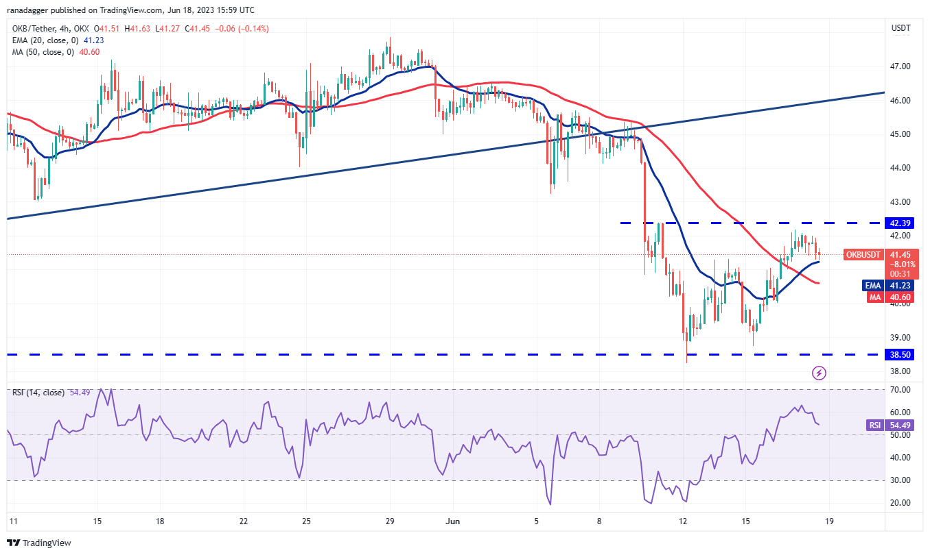 价格已触及 20 日均线(42.73 美元),这是一个值得关注的重要水平。如果价格从当前水平下跌,则表明市场情绪仍然消极,交易员逢高卖出。这可能对 38.50 美元的支撑构成严重威胁。如果这个水平让位,OKB/USDT 对可能会跌至 35 美元,**跌至 30 美元。