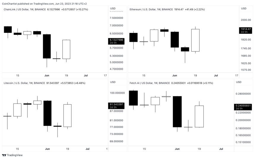 在以太坊(Ethereum)、莱特币(Litecoin)、Chainlink和Fetch.ai等蓝筹山寨币上形成了晨星模式。这种类型的日本烛台模式是一个潜在的看涨反转模式,具有强大的影响。