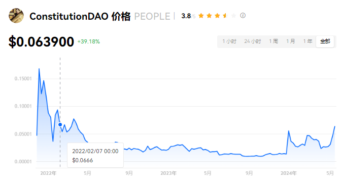 ConstitutionDAO 当前价格为 $0.063900。ConstitutionDAO 的价格在过去 24 小时内上涨了 39.19%。目前,ConstitutionDAO 市值排名为第 132 名,实时市值为 $3.22亿,流通供应量为 5,066,664,005 PEOPLE,**供应量为 5,066,664,005 PEOPLE。我们会实时更新 ConstitutionDAO/USD 的价格。ConstitutionDAO 价格表现 (美元)