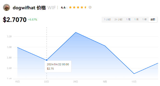 dogwifhat 当前价格为 $2.7070。dogwifhat 的价格在过去 24 小时内上涨了 5.58%。目前,dogwifhat 市值排名为第 41 名,实时市值为 $27.37亿,流通供应量为 998,926,392 WIF,**供应量为 998,926,392 WIF。我们会实时更新 dogwifhat/USD 的价格。dogwifhat 价格表现 (美元)