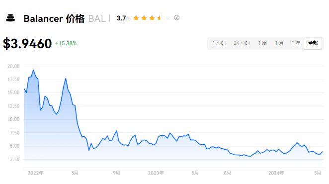 Balancer 当前价格为 $3.9460。Balancer 的价格在过去 24 小时内上涨了 15.38%。目前,Balancer 市值排名为第 154 名,实时市值为 $2.25亿,流通供应量为 56,933,090 BAL,**供应量为 96,150,704 BAL。我们会实时更新 Balancer/USD 的价格。Balancer 价格表现 (美元)