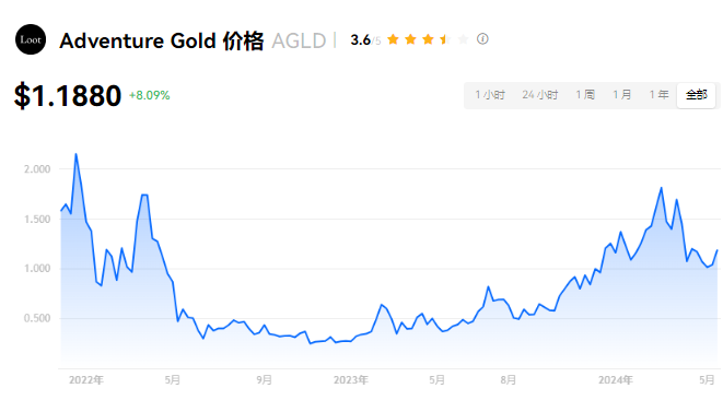 Adventure Gold 当前价格为 $1.1880。Adventure Gold 的价格在过去 24 小时内上涨了 8.10%。目前,Adventure Gold 市值排名为第 209 名,实时市值为 $9,199.89万,流通供应量为 77,310,001 AGLD,**供应量为 80,000,000 AGLD。我们会实时更新 Adventure Gold/USD 的价格。Adventure Gold 价格表现 (美元)